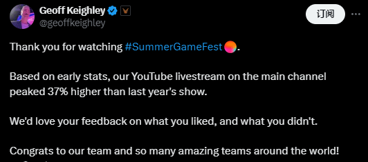 发布会结束后,主持人Geoff Keighley发文表示今年夏日游戏节油管主频道的收视峰值超过了去年节目的37%,他还感谢了玩家们的支持,并祝贺其团队以及世界各地的众多优秀开发者。