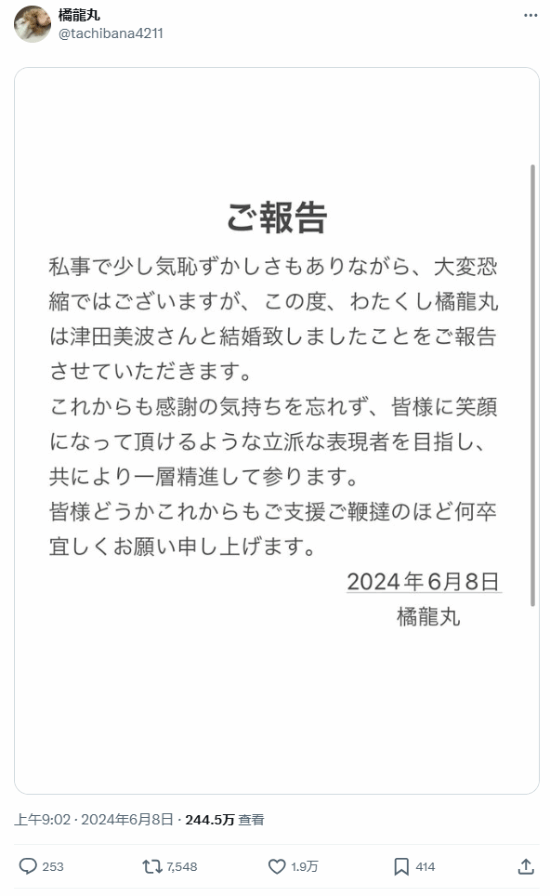 与声优津田结婚的声优橘龙丸也发布声明说明了此事,并表示后续将会与津田美波一起,为声优事业做出更大的努力。在评论区,网友们也纷纷为二人送上了祝福。
