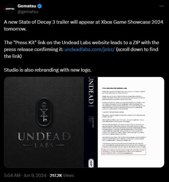 外媒Gematsu发现,开发商Undead Labs似乎不小心在其工作页面上泄露了新闻资料的链接。这个链接指向一篇新闻稿,其中部分内容是:“在6月9日备受期待的Xbox展示会上,Undead Labs在最新的《腐烂国度3》预告片中展示了他们的新品牌。”