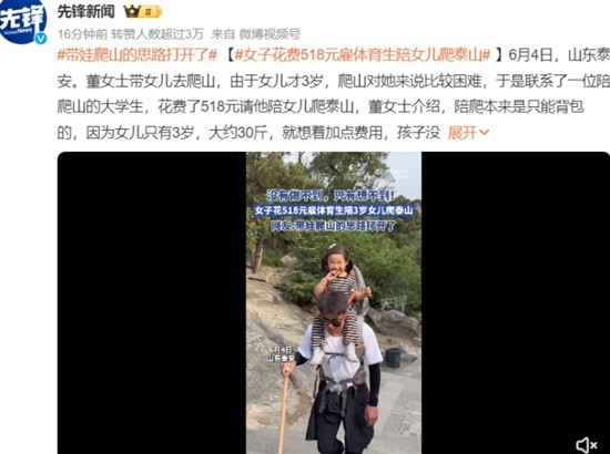 据先锋新闻报道,6月4日,山东泰安。董女士带女儿去爬山,由于女儿才3岁,爬山对她来说比较困难,于是联系了一位陪爬山的大学生,花费了518元请他陪女儿爬泰山。