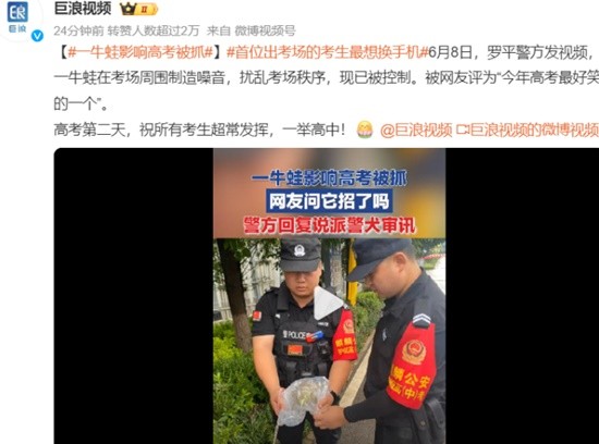 据巨浪视频报道,6月8日,罗平警方发视频,一牛蛙在考场周围制造噪音,扰乱考场秩序,现已被控制。被网友评为“今年高考最好笑的一个”。