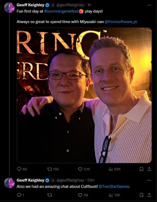 夏日游戏节主持人Geoff Keighley今日更新推文,晒出了同游戏制作人宫崎英高的合影。并配文:“夏日游戏节有趣的第一天!和宫崎英高先生在一起总是很开心。”宫崎英高再现经典神秘微笑。
