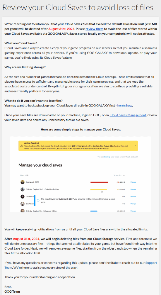 GOG商店在官方声明中表示:“随着游戏大小和数量的增加,对云存储的需求也在增加。这些限制确保所有玩家都能获得足够且可管理的游戏进度空间,并且我们可以控制相关成本。通过优化我们的存储分配,我们的目标是继续为每个人提供一个可靠且玩家非常友好的平台。”