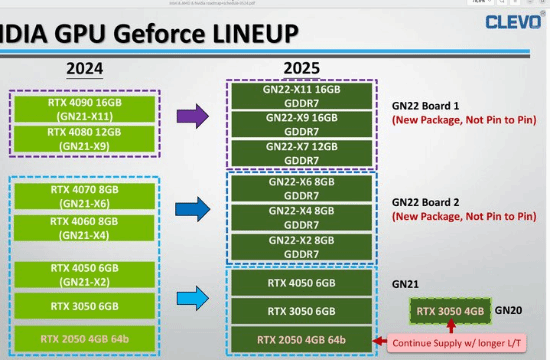 据了解,架构代号为“Blackwell”的RTX 50系列移动显卡至少有6款型号正处于开发中,其将采用最新的GDDR7 显存,最高显存容量可达到16GB: