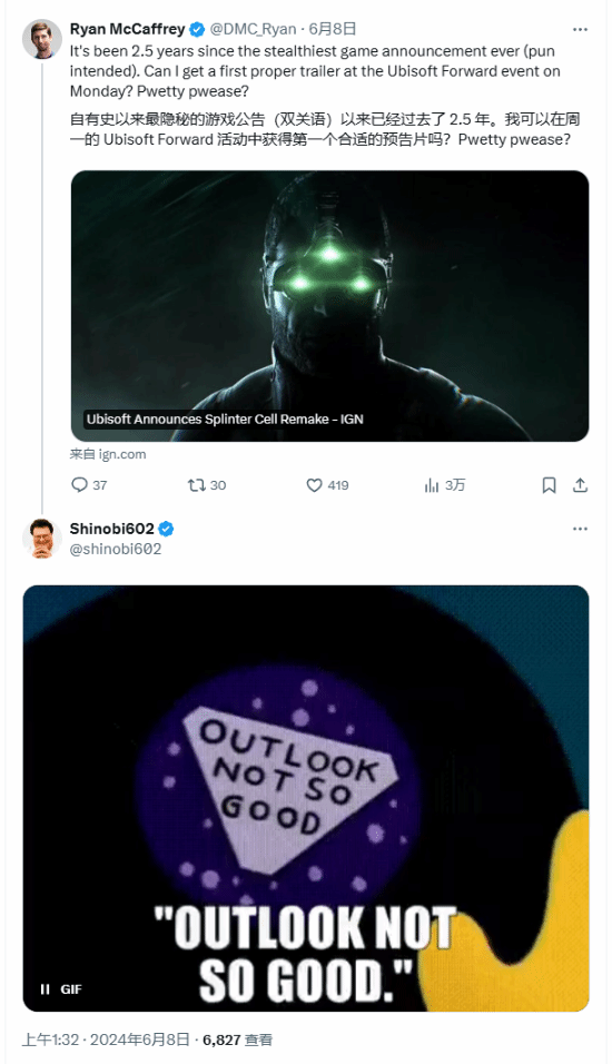 《细胞分裂》粉丝们一直期待在即将到来的2024育碧前瞻会上看到有关《细胞分裂:重制版》的最新消息,然而,这一期待可能要落空了。