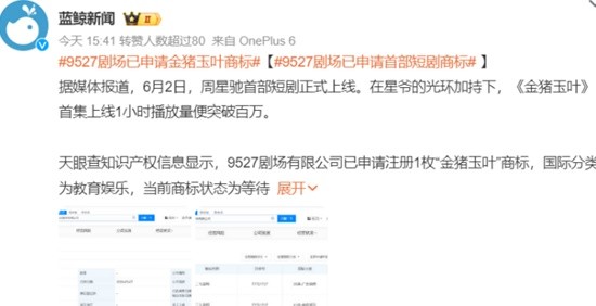 9527剧场有限公司于今年3月在香港注册成立,除上述“金猪玉叶”商标外,还申请了广告销售、教育娱乐类“九五二七剧场”商标。据媒体报道,今年1月,抖音宣布与周星驰达成独家精品微短剧合作,双方联合开发运营“九五二七剧场”。