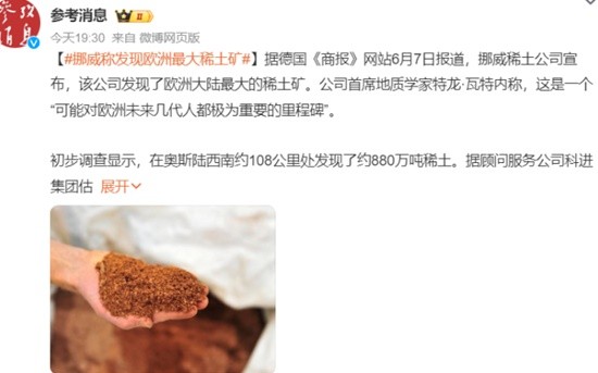 据参考消息报道,德国《商报》网站6月7日报道,挪威稀土公司宣布,该公司发现了欧洲大陆最大的稀土矿。