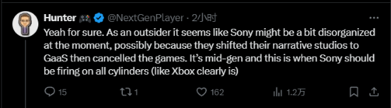 “确实如此,作为局外人来看,索尼目前似乎有点混乱,可能是因为他们将精力放在了太多服务型游戏上,然后又取消了游戏。现在是中期阶段,索尼应该全力以赴(Xbox 显然也是如此)。”