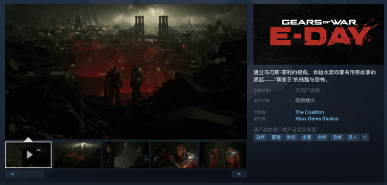 在今日的Xbox展示会上,《战争机器》系列新作(前传)《战争机器:E-Day》公开了首支预告。游戏的Steam页面现已上线,多张官方截图公开。