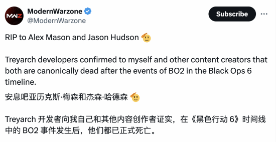 据COD资讯博主@ModernWarzone消息,Treyarch开发者已证实,在《使命召唤21:黑色行动6》的时间线中,亚历克斯·梅森和杰森·哈德森都已死亡,延续《黑色行动2》中的死亡剧情。