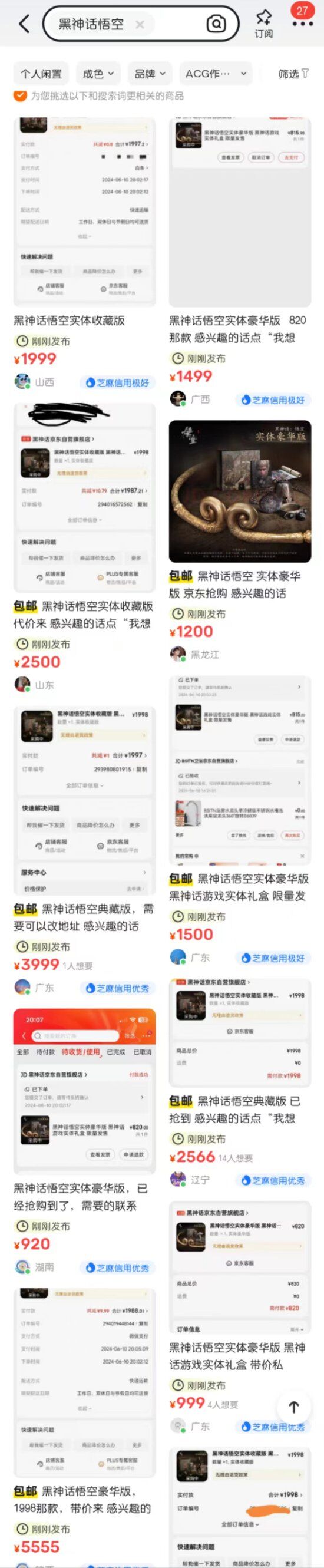 与此同时,在二手交易平台上,搜索《黑神话悟空》关键字,已经涌现出大量加价转卖的信息。尤其是实体豪华版,部分卖家甚至将其加价近3000元进行出售,甚至还有不少已经成功卖出,进一步证明了这款游戏的火爆程度。