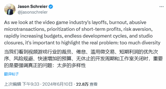 Schreier在发言中提到:“当我们审视游戏行业的裁员、倦怠、滥用微交易、优先考虑短期利润、规避风险、迅速增加的预算、无休止的开发周期和工作室关闭时,重要的是要突出真正的问题:多样性(DEI)过多。”
