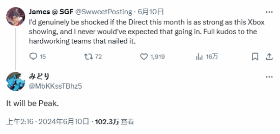 みどり在回复一位玩家的留言时发表了上述观点。这位玩家表示:“如果本月任天堂直面会的质量能够像本次Xbox发布会那样,我真的会感到震惊,我从没想过会这样,向辛勤工作的团队致以崇高的敬意。”