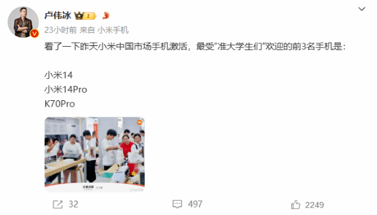 近日,小米集团合伙人卢伟冰在微博发文表示:“看了一下昨天小米中国市场手机激活,最受“准大学生们”欢迎的前3名手机是:小米14、小米14Pro与K70Pro。”据悉,小米14、小米14 Pro和Redmi K70 Pro起售价分别为3999元、4599元和2999元,性价比极高,且配置也都同样出色。
