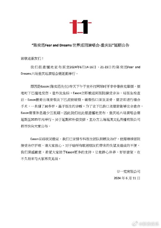 11日,陈奕迅演唱会主办方发公告,宣布6月在重庆的6场演唱会延期。