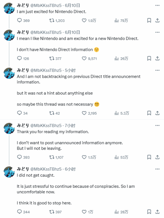 みどり表示:“我只是对任天堂直面会感到兴奋而已。我的意思是我喜欢任天堂,但我并没有关于任天堂直面会的消息。”みどり又补充道:“我不想再发布未经宣布的信息了,但我不会离开。”