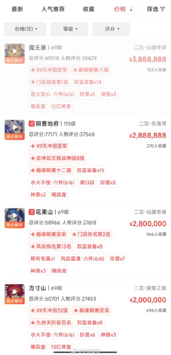 11日下午,记者在“藏宝阁”平台看到,目前在售的《梦幻西游》手游账号根据级别、装备等不同,售价从61元到300多万元不等,其中售价最高的388.88万元的角色,目前显示已有玩家正在下单。