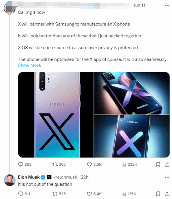 周一,一位X平台(推特)用户发推文预测马斯克将打造一款X Phone,马斯克对此回复称,“这并非不可能”。