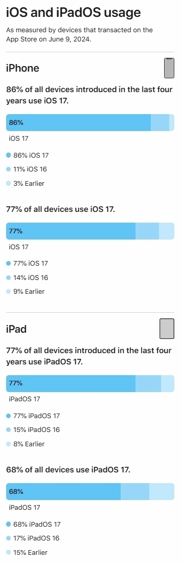 数据显示,77%的iPhone已更新至iOS 17,68%的iPad已更新至iPadOS 17,在过去四年内发布的iPhone里,有86%的设备已更新至iOS 17,而在过去四年内发布的iPad里,有77%的设备已更新至iPadOS 17。