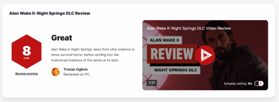 《心灵杀手2》首个DLC“夜泉镇”媒体评分现已解禁,IGN为该DLC打出8分好评。