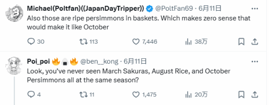 从长实机演示的第5分18秒处开始,推主PoltFan69表示:“为什么樱花盛开的时候水稻还在生长?”PoltFan69还补充道:“而且场景里的篮子装的是成熟的柿子,这根本说不通,因为那是10月的事情,哪有三月樱花、八月大米与十月柿子在同一季节的?”