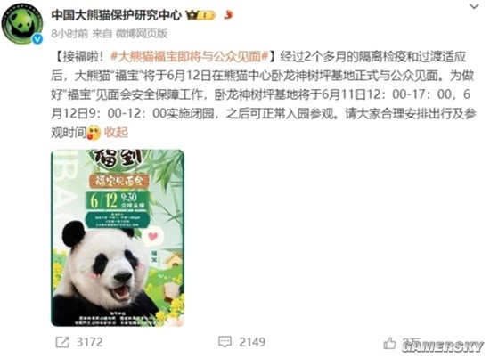 据悉,经过2个多月的隔离检疫和过渡适应后,大熊猫“福宝”将于6月12日在熊猫中心卧龙神树坪基地正式与公众见面。