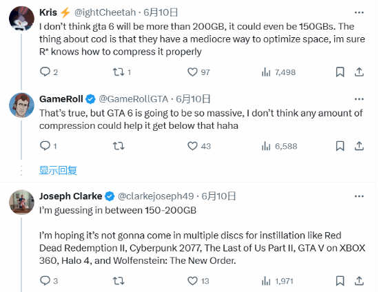 在评论区中,玩家们对《GTA6》的容量看法不一,有玩家表示《GTA6》容量不会超过200GB,因为R星知道该如何压缩游戏空间。也有玩家对容量毫不在意,表示自己会把整块硬盘献给《GTA6》。