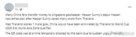 国足球迷超热情:新加坡门将收款码被刷爆!
