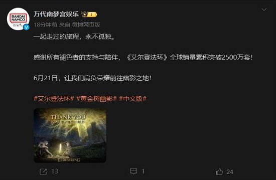 《艾尔登法环》官方今晚发文,宣布本作销量突破2500万!
