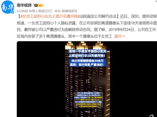 据南华视频报道,近日,深圳,据劳动报报道,一女员工因担心个人隐私泄露,在公司安装的高清摄像头下连续18天使用雨伞遮挡,最终被公司以严重违纪为由解除劳动合同。