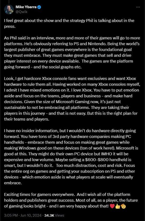 暴雪前总裁迈克•伊巴拉(Mike Ybarra)表示,鉴于微软游戏的庞大规模,现在有理由在PlayStation和任天堂平台上推出一些Xbox游戏。