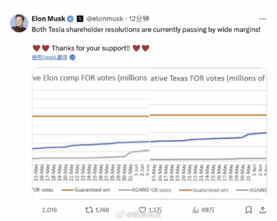 今日特斯拉 CEO 马斯克发文称,特斯拉的两项股东决议均以较大优势获得通过。马斯克分享的图片显示,两项决议(马斯克的薪酬、特斯拉总部迁至得克萨斯州)均获得股东投票通过。