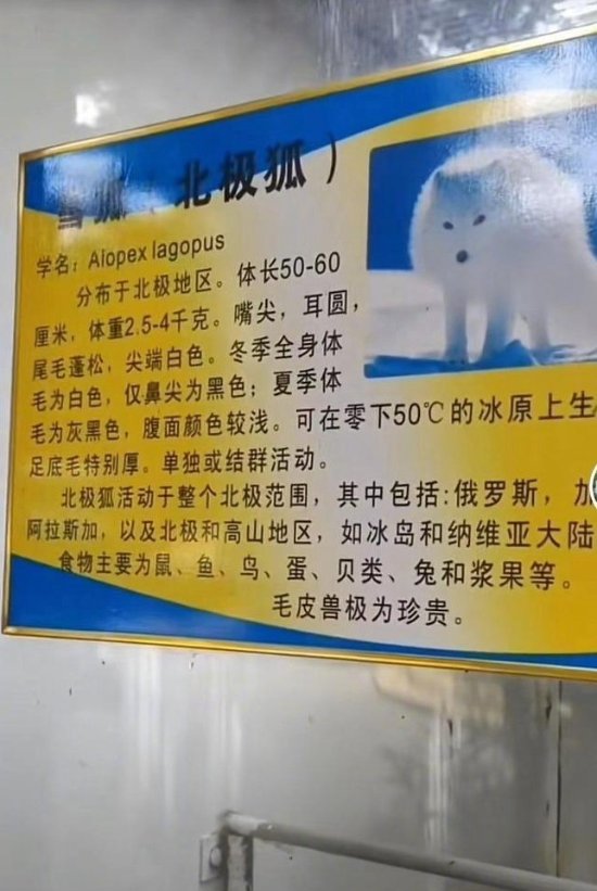 在饲养区外的介绍牌上写着,北极狐分布于北极地区,冬季全身体毛为白色仅鼻尖为黑色,夏季体毛为灰黑色腹面颜色较浅,可在零下50度的冰原上生活。