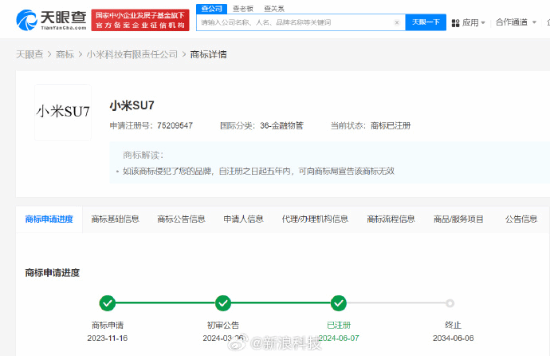 新浪科技报道,天眼查知识产权信息显示,近日,小米科技有限责任公司申请注册的一枚“小米SU7”商标已注册成功,该商标国际分类为金融物管,申请于去年11月。