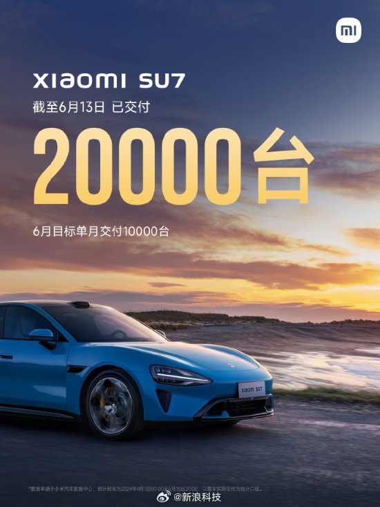今日上午,小米汽车在官方微博表示:“向大家汇报下我们的最新进展:截至昨天,小米SU7累计交付已突破20000台。感谢大家的支持!6月我们的单月交付将突破1万台,全年我们将保障交付10万台,冲刺12万台! ”