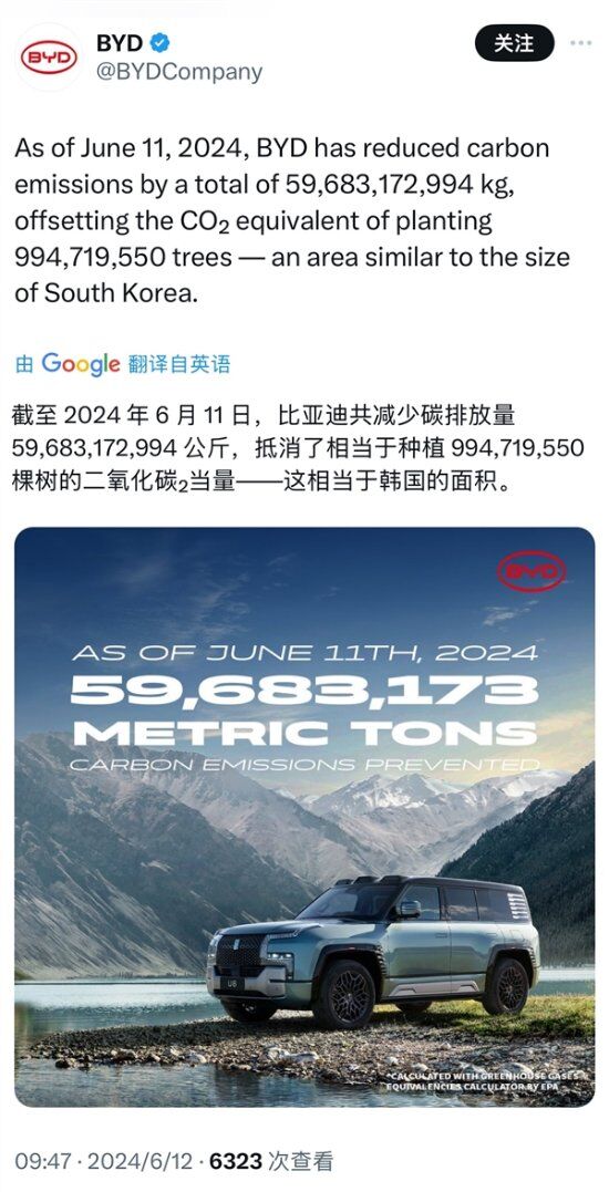 截至2024年6月11日,比亚迪共减少碳排放量59683172994千克,抵消了相当于种植994719550棵树,这相当于韩国的面积。