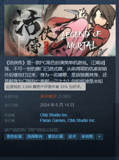 角色扮演游戏《活侠传》已经于昨日在Steam平台发售。然而,截至目前,该游戏在Steam上的评价多半为差评。在3580位用户评价中,好评率仅为33%。