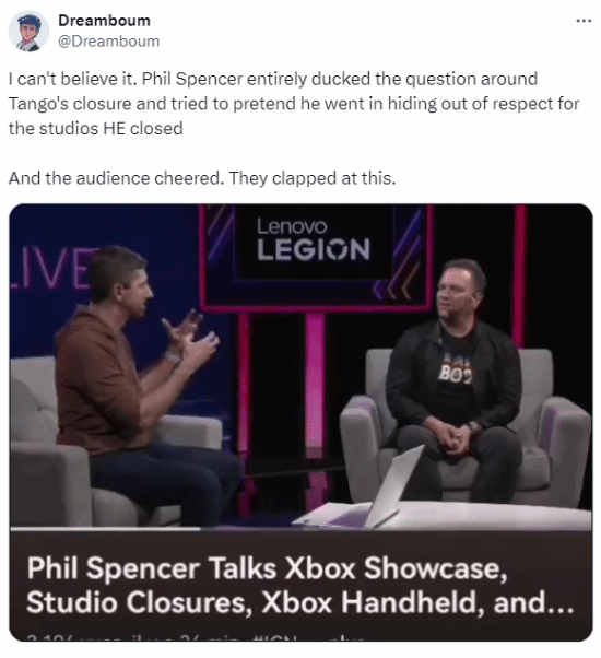 当聊到关闭Tango等工作室的问题时,斯宾塞似乎有意回避,并将话题转向了为了经营一家可持续发展的企业而做出艰难决定是多么痛苦。令许多玩家诧异的是,现场观众听到这个回答后竟然欢呼了起来。