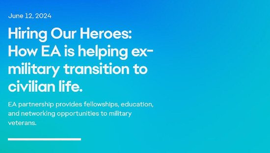 6月12日,EA官网分享文章,介绍了旗下的“雇佣我们的英雄”计划,该计划旨在通过雇佣退伍军人,以此来为他们提供奖学金、教育和社交机会,并在他们的帮助下进行《战地》等游戏的开发。