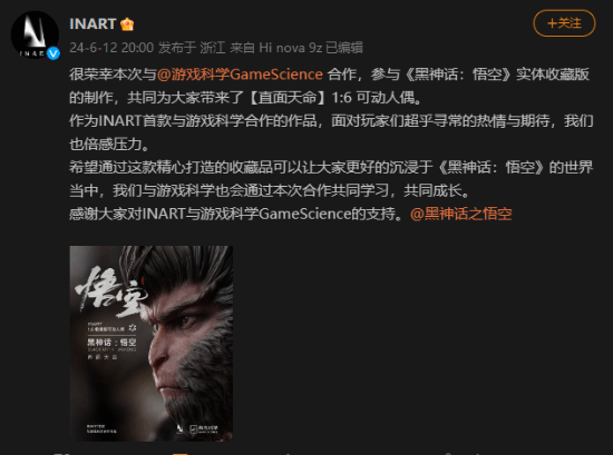 日前,《黑神话:悟空》实体收藏版【直面天命】1:6可动人偶背后的厂商INART亮出庐山真面目,发文庆祝与游戏科学的首次合作。