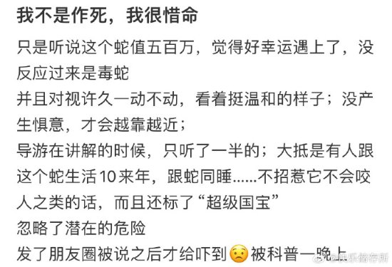 近日有博主分享了自己的一则经历,简单来说,遇见国宝合了影,发了朋友圈,才知道自己近距离接触的是毒蛇。