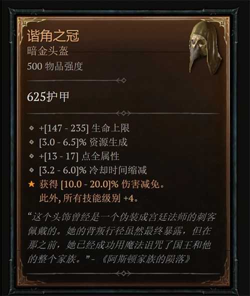 《暗黑4》最强欧皇诞生了,这顶军帽附带全技能+4的逆天属性,相当无敌,同时还提供大量生命上限、资源生成、全属性、冷却时间缩减、伤害减免等。