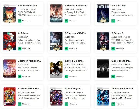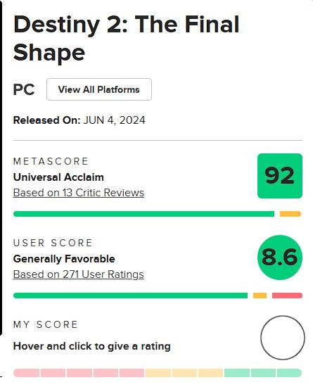 根据Metacritic上的13条媒体评论,《命运2:终焉之形》目前的总分为92分。这也使得该资料片同《最终幻想7:重生》一样并列成为2024年评分最高的游戏,超过了《小丑牌》和《Animal Well》这样的Roguelike游戏。