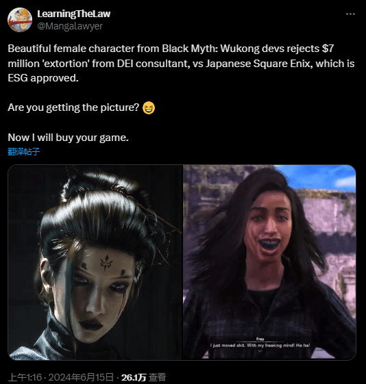 “《黑神话:悟空》里有着漂亮的女妖精,开发者拒绝了SBI勒索的700万美元,而SE的游戏获得了ESG的批准,提供所谓开放、包容的体验。看看这张对比图,我会买哪个游戏不言而喻。”