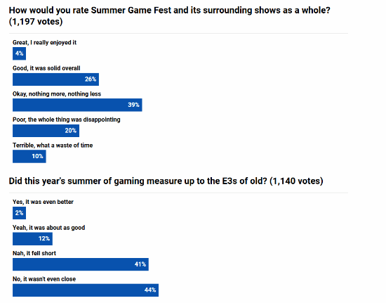 截止发稿前,共有1197人参与投票,其中表示满意的玩家仅有约30%,约39%的玩家对这些展会的态度处于折中状态,约20%的玩家表示六月份的这些展会很糟糕,整体表现让人失望,而约10%的玩家表示观看这些展会很浪费时间。