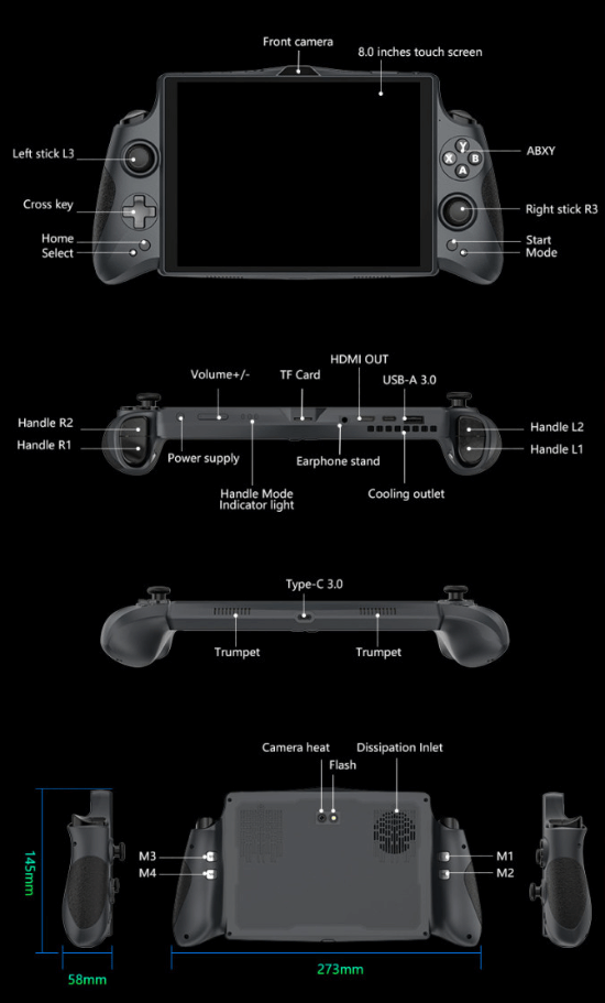 TJD T80掌机有两款配置可供选择,RK3568/4GB/128GB版本价格为199美元(约合人民币1443元);RK3588S/8GB/256GB版本价格为399美元(约合人民币2895元)。除此之外,掌机的三围为273 x 145 x 58mm,重630g,内置10000mAh电池,接口配置与按键布局如下: