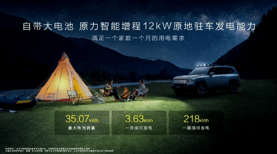 同时,新车具备原地驻车发电能力,智能增程最大发电功率12kW,一箱油可发电218度电,叠加车辆自带的35.07kWh大电池,整车最多储备250多度电,能够满足家庭用户户外一个月的用电需求。