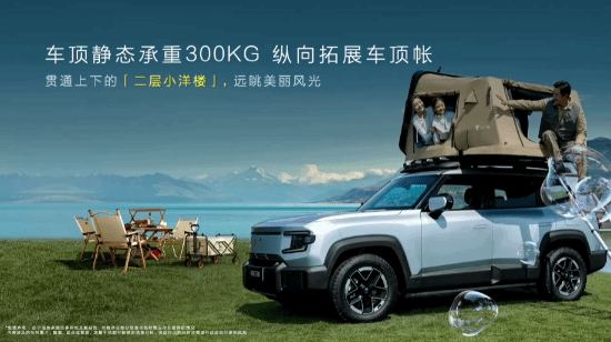 对露营爱好者来说,后排座椅可以完全放倒,车内形成1.8米双人床;而且,车辆顶部的行李架动态动态承重可达80kg,静态承重更是高达300kg,整车可以扩充成二楼小洋房,上下双层空间能够容纳五人休憩。