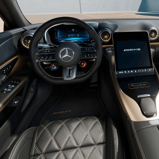 该车座舱采用黑色定制座椅,并配有复杂的菱形缝线,扶手、中控台和许多其他细节都是根据金色规格定制,镀铬饰面的 MANUFAKTUR 字样等标志性元素凸显了汽车的非凡个性。新车配备有 12.3 英寸液晶仪表和 11.9 英寸中控大屏,标配第二代 MBUX 人机交互系统。同时还提供 AMG TRACK PACE 虚拟竞赛工程师车载应用。