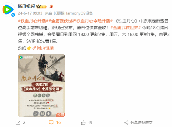 今日,腾讯视频宣布系列单元剧《金庸武侠世界》中的《铁血丹心》将于今晚18点正式开播。会员周日到周四 18:00 更新2集,周五、六 18:00 更新1集,首更3集,SVIP 抢先看1集。此沙饰郭靖、包上恩饰黄蓉、王弘毅饰杨康。